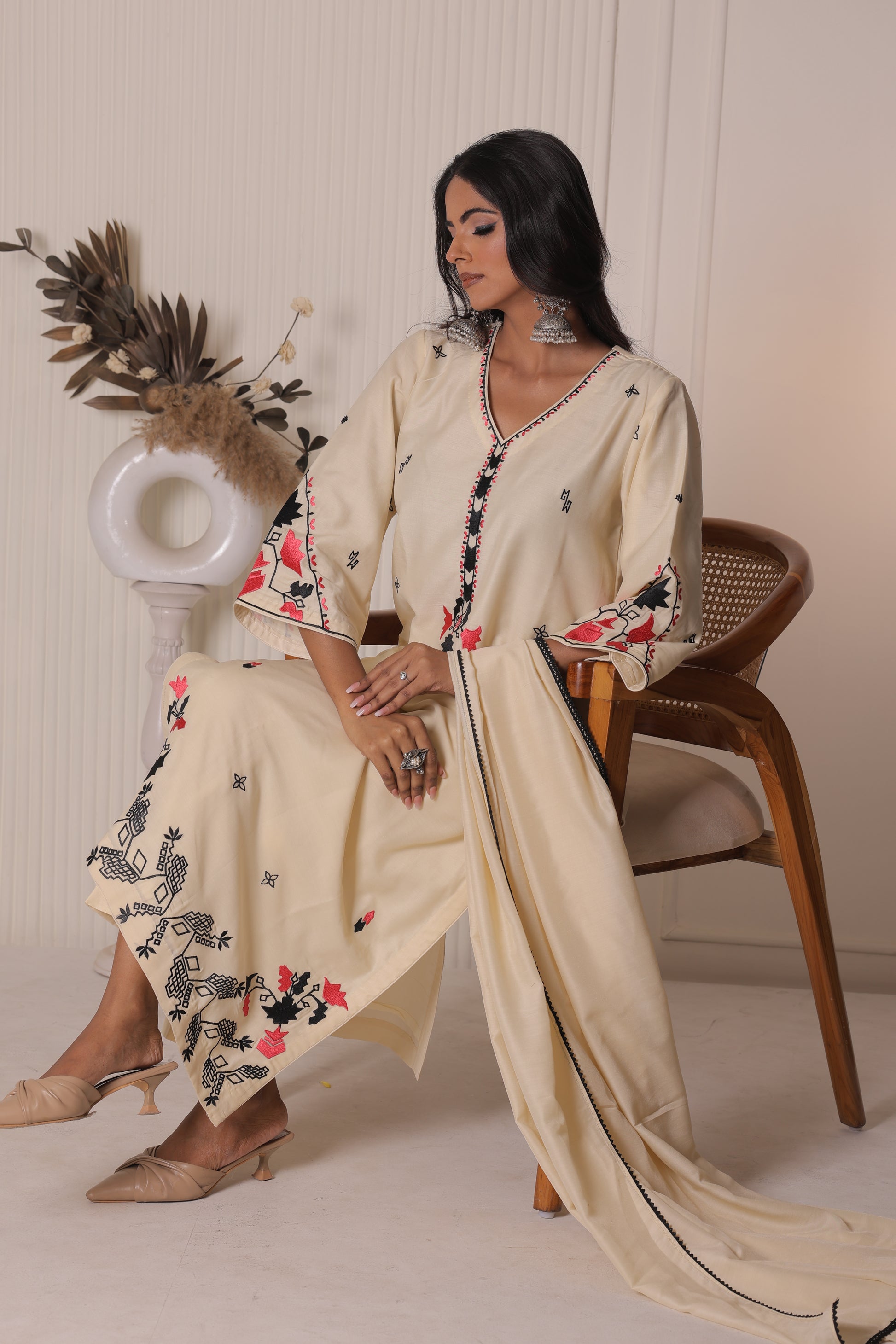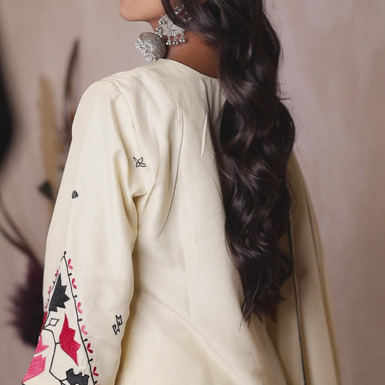 Embrace effortless elegance with Noor-e-Khaas, a refined ivory satin silk suit set that radiates sophistication. This three-piece ensemble is elevated with precision machine embroidery, featuring traditional motifs in striking red and black thread. Perfect for festive occasions orgraceful daywear, this outfit seamlessly blends tradition with comfort.