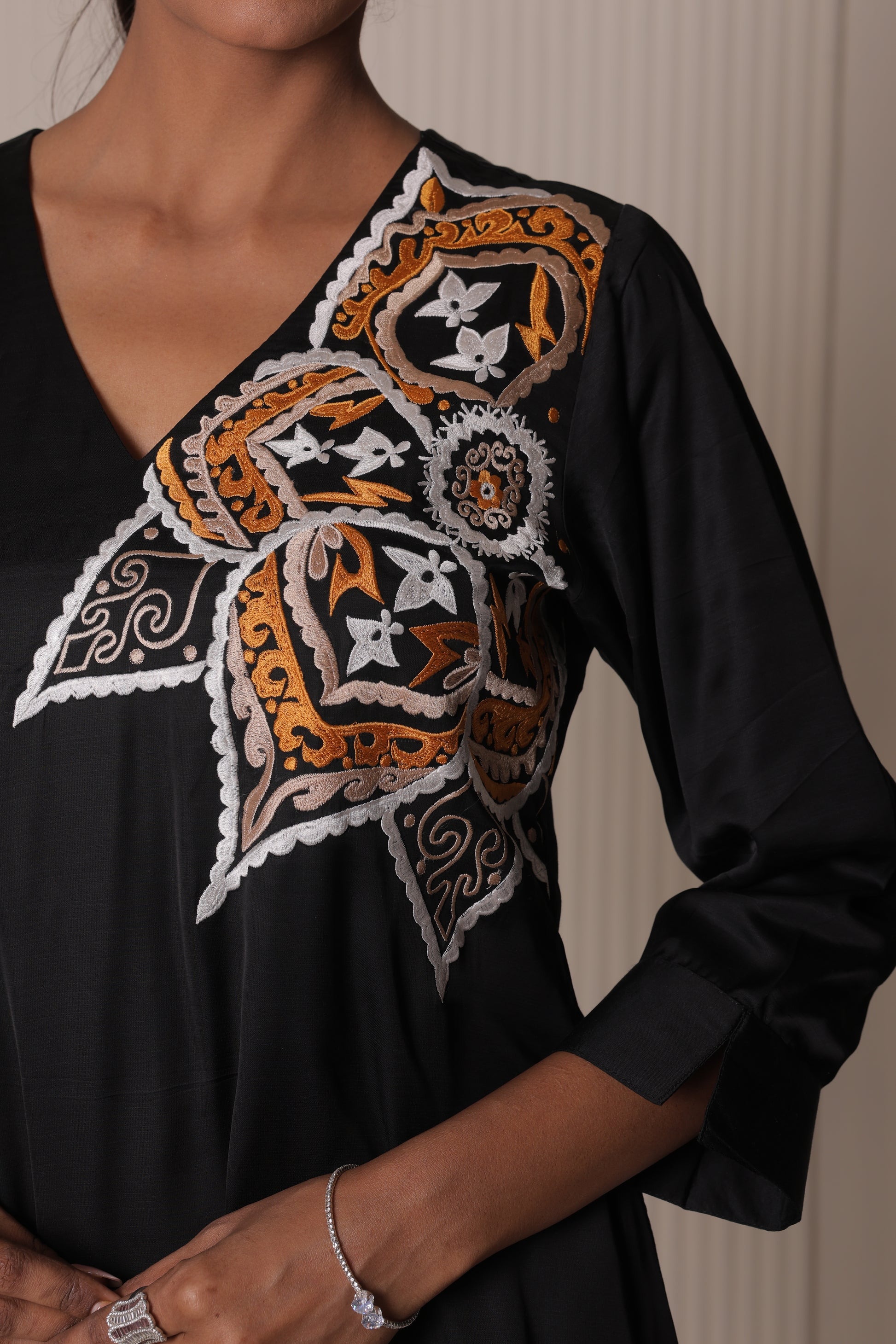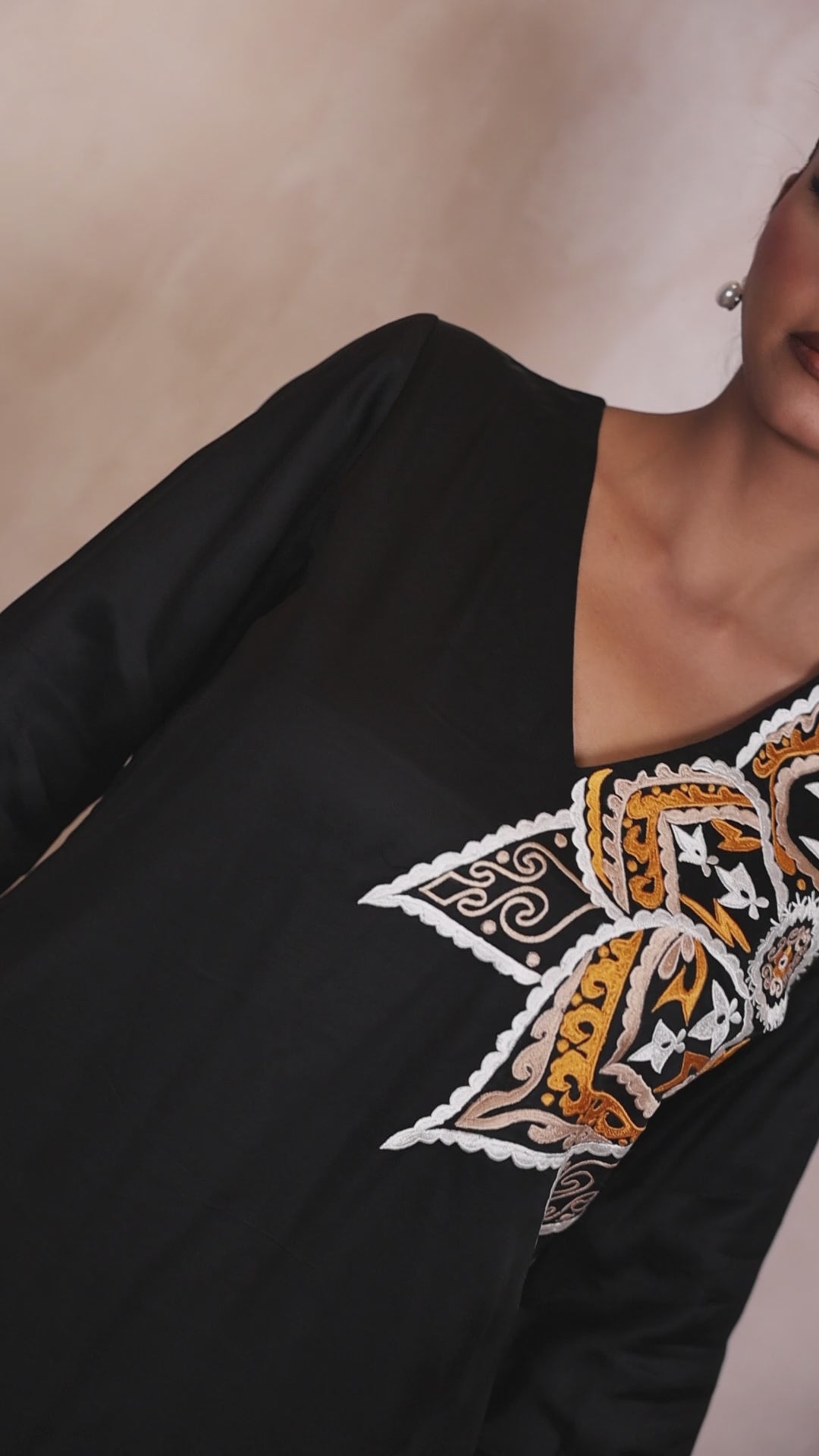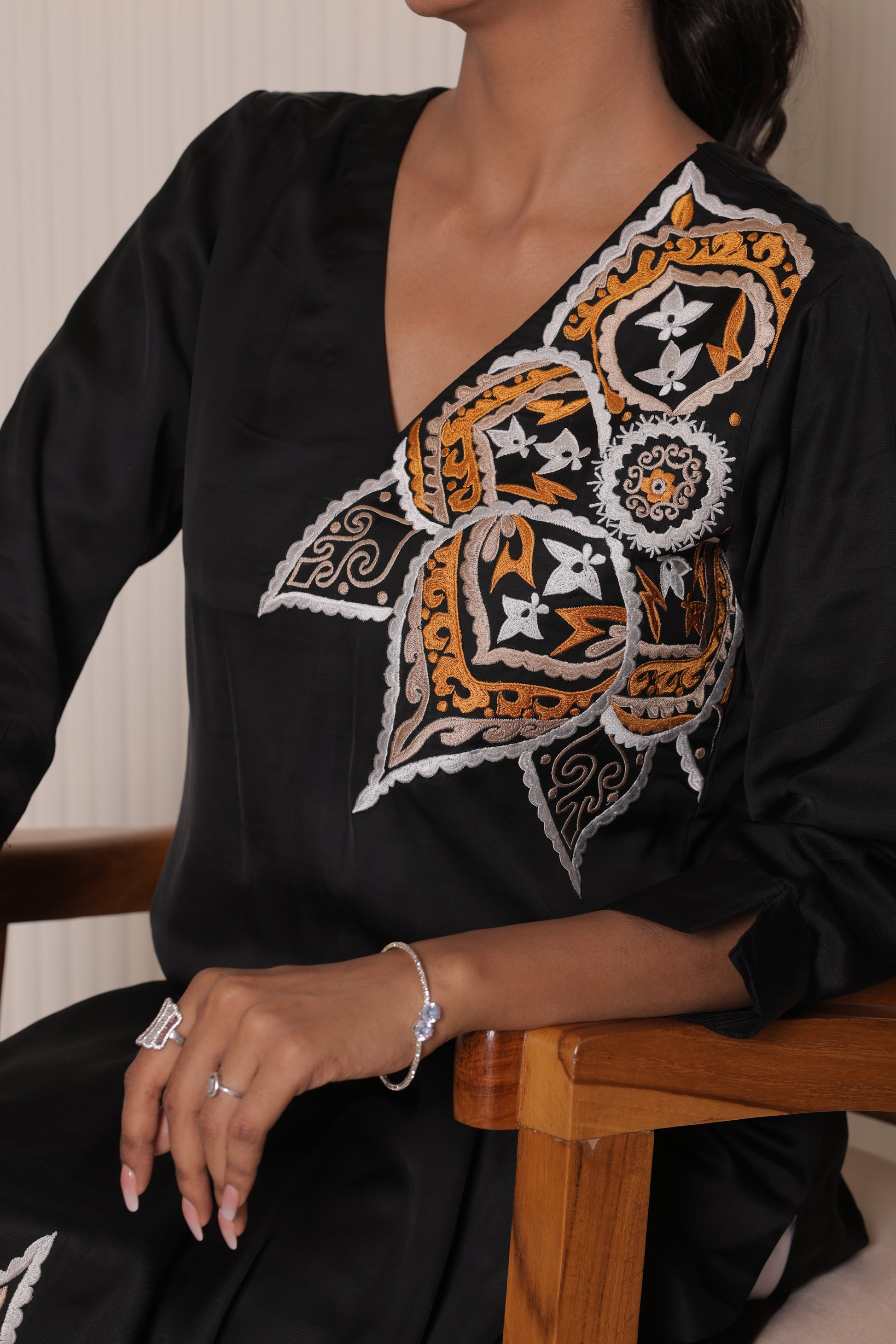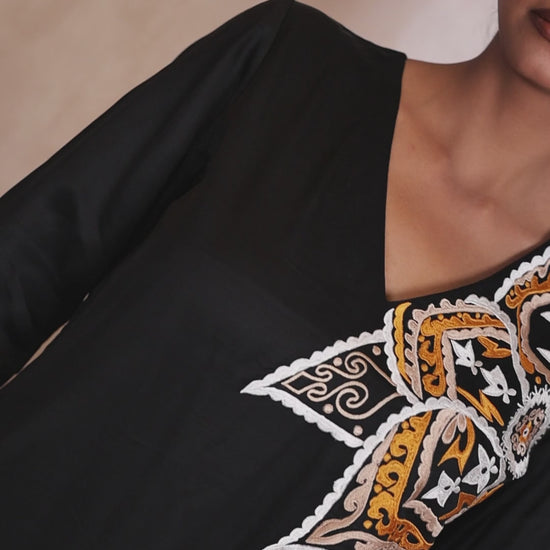 Mehek-e-Siyah — a scent stitched into every thread, blooming softly in the silence of the night, luxurious to wear this piece is perfect for moonlit evenings soulful gatherings, or moments when your presence speaks louder than words it's poetry in motion.Crafted in rich satin silk, this elegant black kurta captures the mystique of the night and the soul of a Sufi verse.Delicate thread embroidery blooms like fragrance over darkness, giving life to silence.