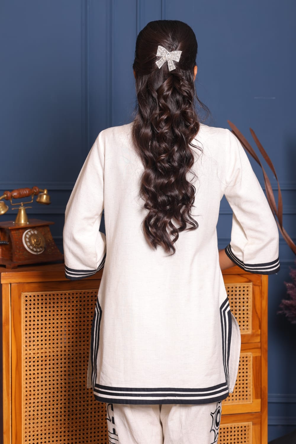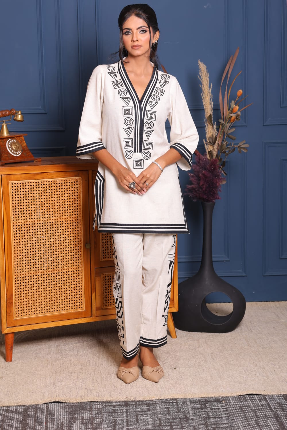 Elevate your everyday style with this elegant off-white co-ord set, adorned with bold black geometric embroidery. The kurta features a sharp V-neckline with tribal-inspired detailing and relaxed 3/4th sleeves. The matching straight pants are finished with coordinated embroidery and striped hems, adding a contemporary flair. Crafted in soft, breathable fabric, it’s perfect for casual outings or workwear.